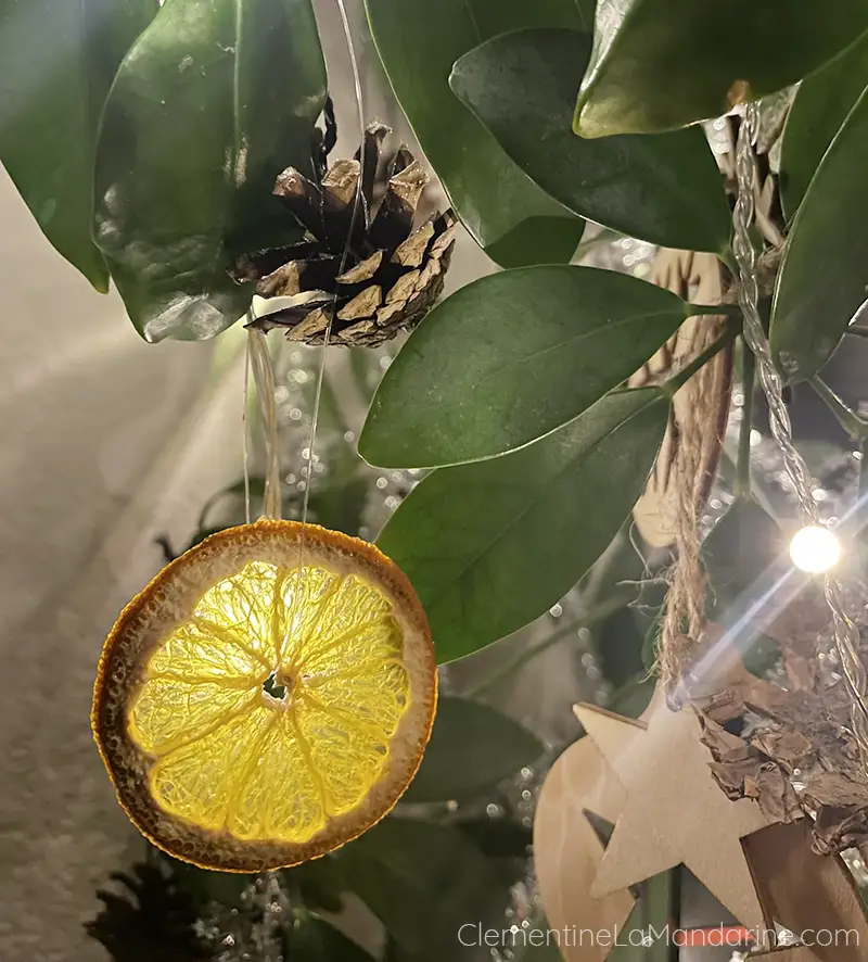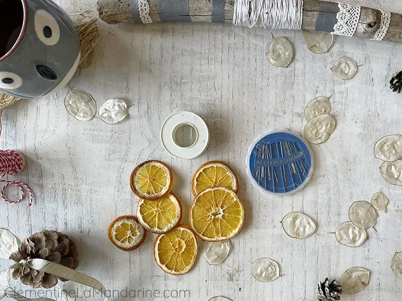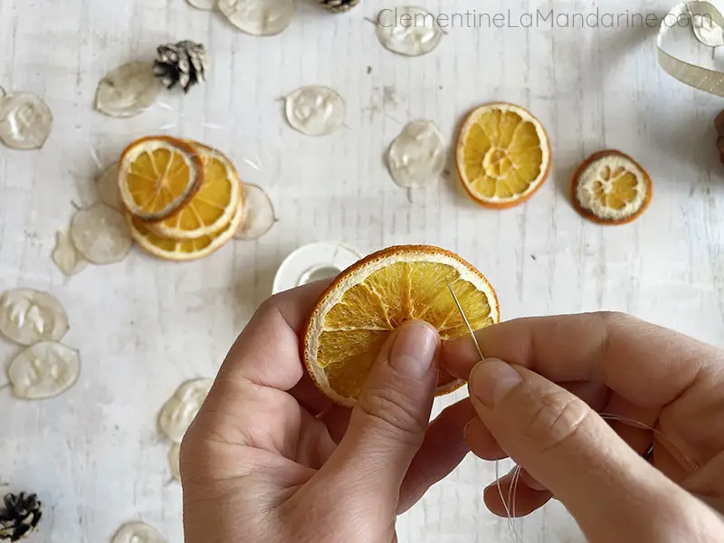 Ajoute une ficelle une fois les rondelles sèches. Passe-la soit dans un trou de la tranche d’orange, soit avec une aiguille et du fil.
