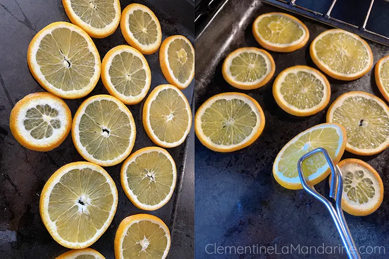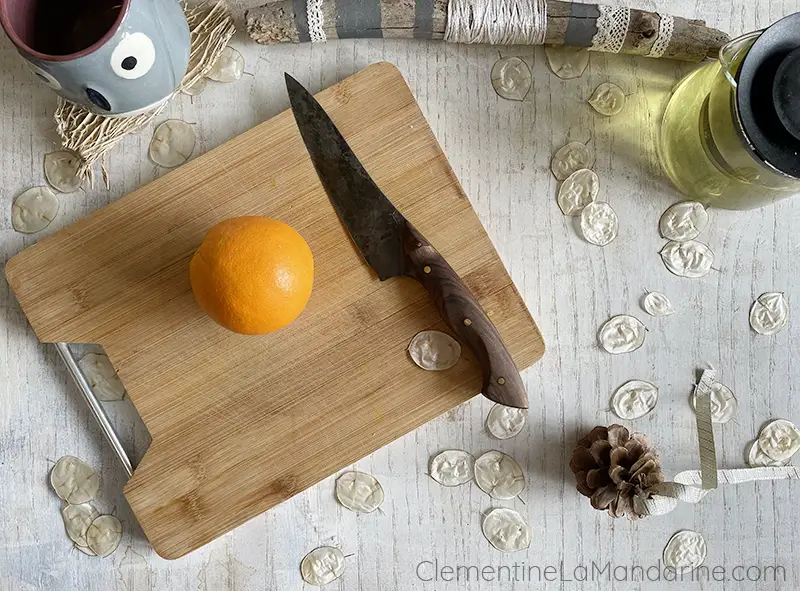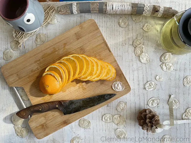 Découpe des rondelles d’orange d’environ 3 mm d’épaisseur.