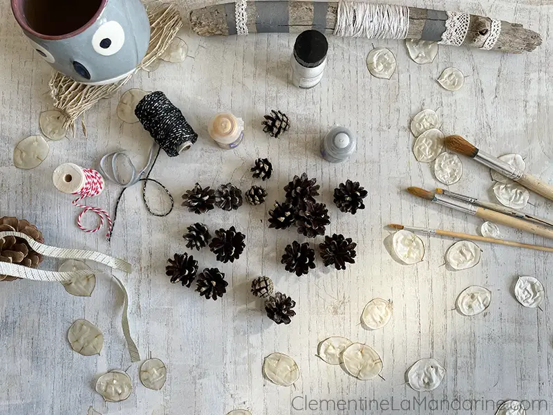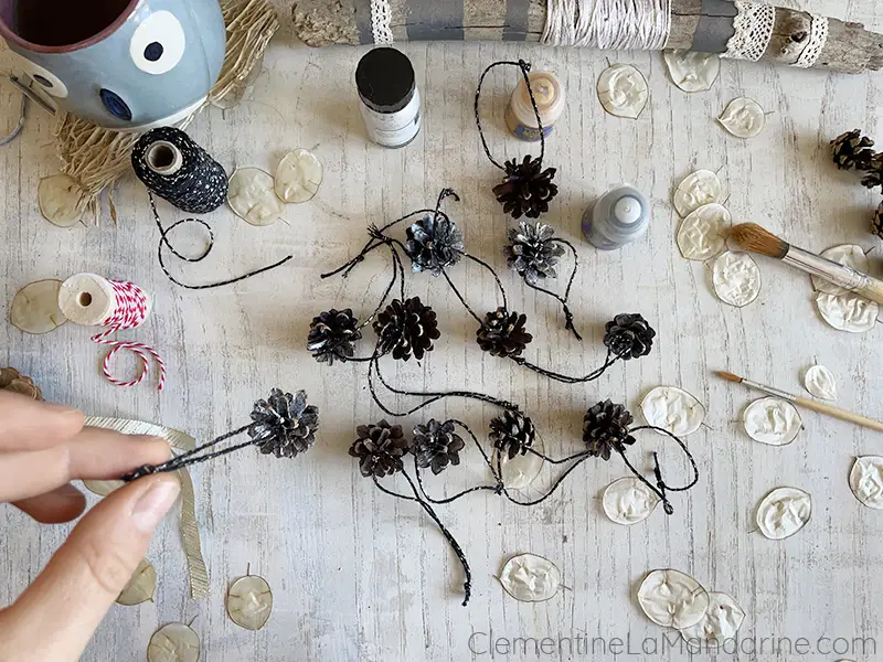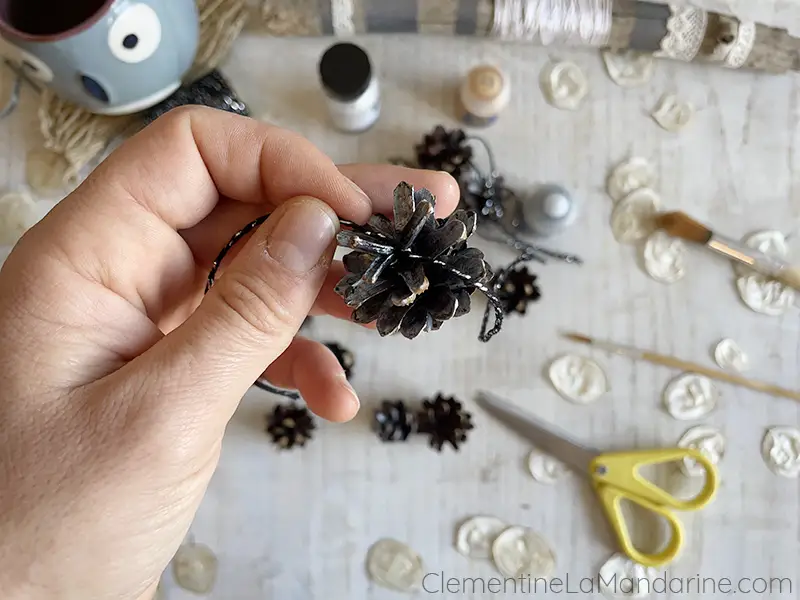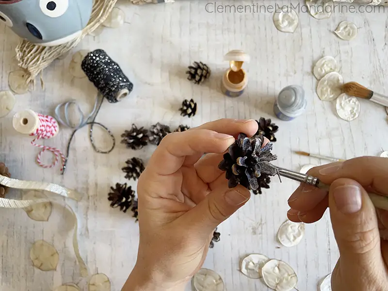 Peins tes pommes de pin en argenté. Cette étape est optionnelle, c’est déjà très joli sans peinture ! Laisse sécher.