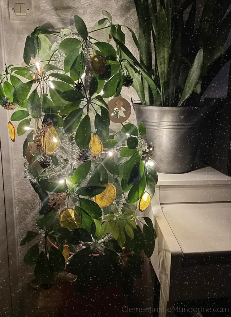 - on n’achète pas de sapin : quelle idée d’aller couper un arbre pour lui faire orner le salon pendant un mois – sans parler des problèmes associés à cette culture. On décore nos multiples plantes d’intérieur. Monstera et ficus de Noël, nous voilà. Sur le balcon, nous avons un citronnier de Noël avec une guirlande qui se recharge grâce à un petit panneau solaire – et reste en place à l’année.