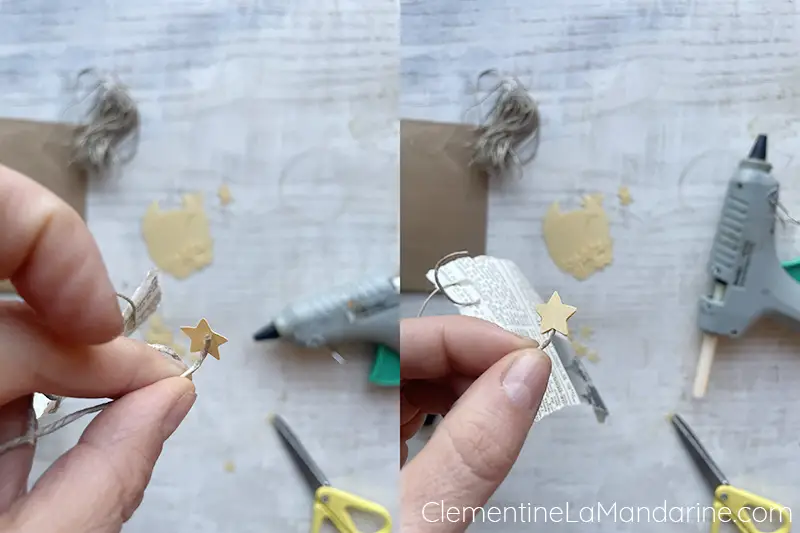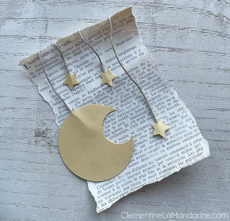 Colle les étoiles et la lune au bout des ficelles, en prenant les brins de ficelle en sandwich.