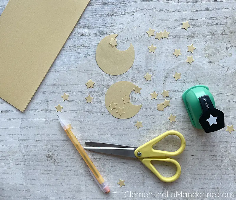 Découpe avec tes perforatrices ou aux ciseaux les étoiles et la lune en double. Colorie-les en argenté ou doré si besoin.